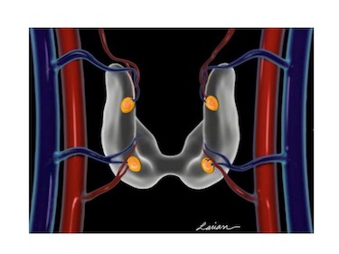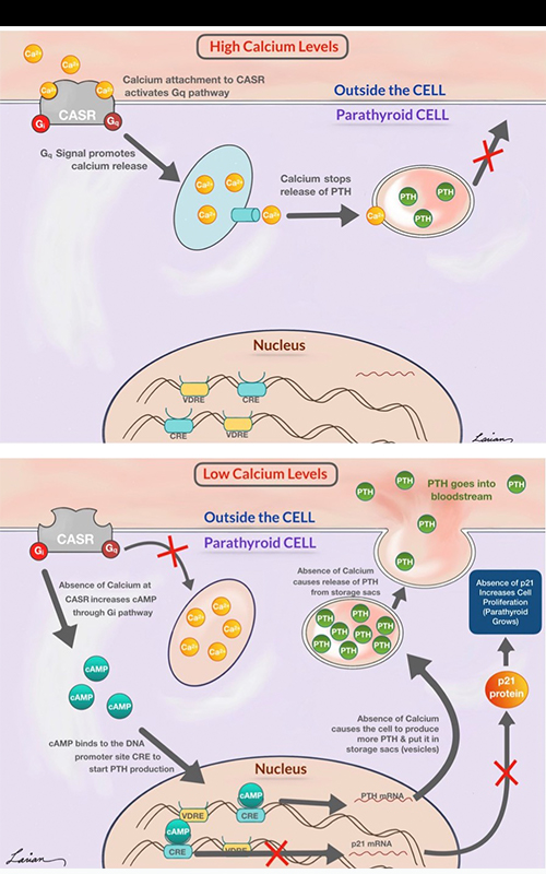 Hyperparathyroidism is where the parathyroid glands (in the neck, near the thyroid gland) produce too much parathyroid hormone.