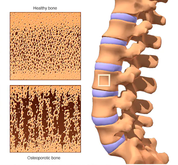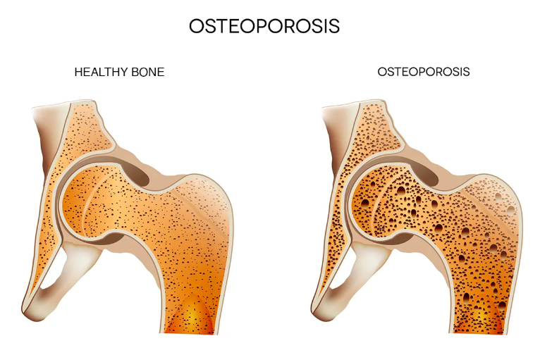 Osteoporosis is a bone disease that develops when bone mineral density and bone mass decreases, or when the quality or structure of bone changes. This can lead to a decrease in bone strength that can increase the risk of broken bones (fractures).
